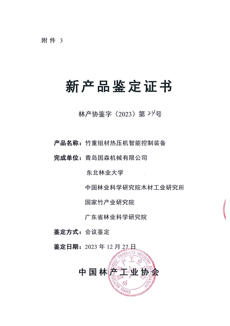 近日,由青岛国森机械有限公司、东北林业大学、中国林业科学研究院木材工业研究所、国家竹产业研究院和广东省林科院共同研发完成的竹重组材热压机智能控制装备通过新产品鉴定。
